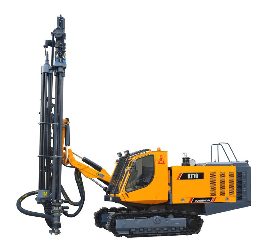 KT10型一體式潛孔鉆車以康明斯國三柴油機為單一動力,通過兩端輸出的方式同時帶動螺桿壓縮系統和液壓傳動系統,可鉆鑿φ90-125mm垂直、傾斜和水平孔,主要用于露天礦山和石方工程鉆鑿爆破孔和預裂孔等。鉆車配有自動接卸桿系統和鉆桿潤滑模塊,可實現單人操作,減少礦山作業人員。鉆車主操縱動作集成在一個手柄上,操作簡單,配有防卡鉆系統,并可選配鉆孔角度和深度指示,簡化了鉆孔過程控制并改善成孔質量。高效的集塵系統、寬敞的駕駛室、大功率冷暖空調和優良的音響設備提供了優良的操作環境,大限度提高操作人員工作效率。